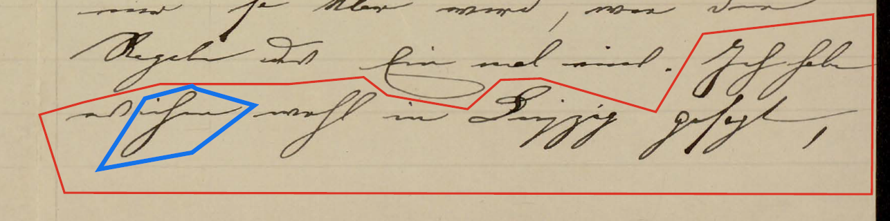ところが、なんと McLarty の英訳の方が正しかったのである。次の画像は、その後に、Göttingen に依頼して、作成してもらったカラー画像の該当部分である。2ページにわたって書かれているので画像が二つあり、赤線で囲まれたものが、問題の文で、青線で囲まれた部分が、 ihm である。