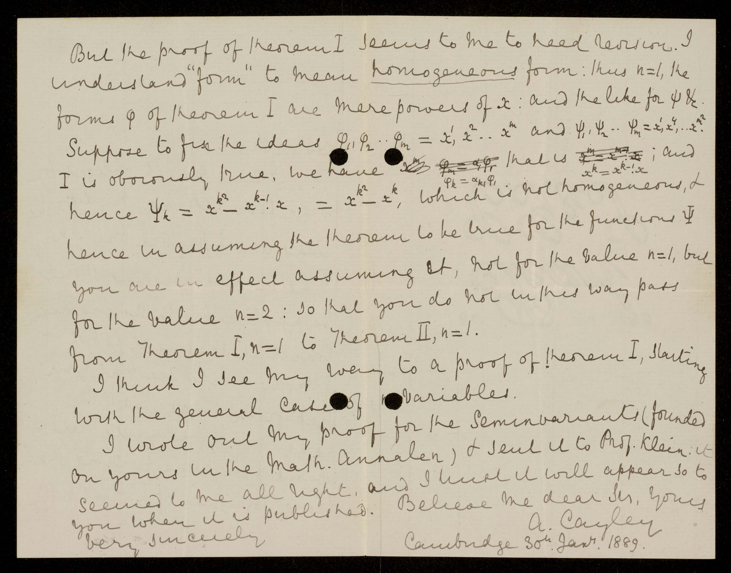 第一速報の Theorem I と Theorem II の証明が間違えていたことは、すでにのべたし、その反例も宿題4の答として示したが、実は、あの反例は、Hilbert に宛てて Cayley が1889年1月30日の書簡にある、Theorem I から Theorem II への推論ステップに間違いがあることを示すために書かれていた例だったのである。