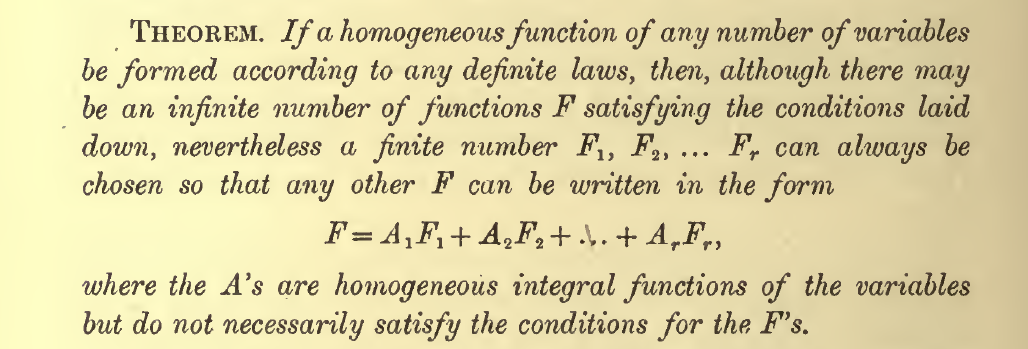 私は今では、そういう懸念を持つ人たちは、当時としても比較的少数派だったのではないかと思っているが、優れた数学者の中に相当数、そういう人たちがいたことも確かだろう。また、それらを拒否しないまでも、伝統的な思考様式に拘りを持っていたと思われる人たちもいた。たとえば、この講義の有限基底定理 Theorem I は[Grace&Young1903]のものを参考にしているが、この教科書では、有限基底定理を任意の無限列 \(F_1,F_2,\ldots\) に対して定式化するのではなく、次の様に定式化している。